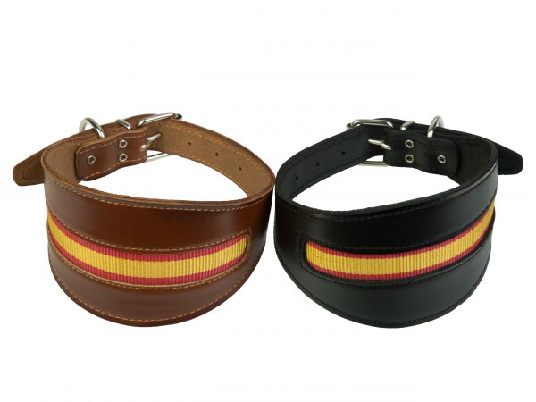 Collar para galgo ancho en piel marrón y negra con la bandera española. Medidas 45cm. de largo.